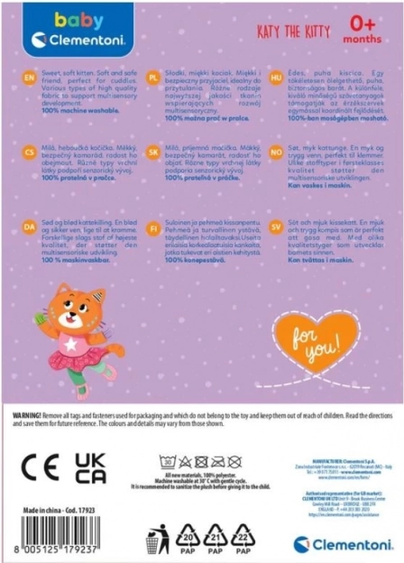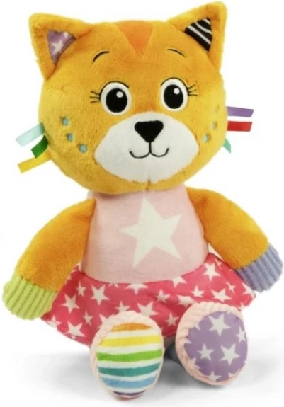 Pluszowy kotek wyróżnia się wielobarwnym wyglądem i zróżnicowanymi fakturami, które stymulują zmysły dziecka.