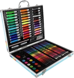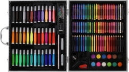 150 sztuk różnych narzędzi artystycznych, w tym flamastry, kolorowe ołówki i farby, starannie zorganizowane dla łatwego dostępu do tworzenia.