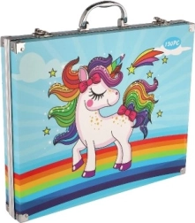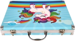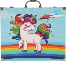 Ta walizka przyciąga uwagę swoim wesołym designem z jednorożcem z tęczową grzywą i ogonem, co czyni ją idealną dla małych artystów.