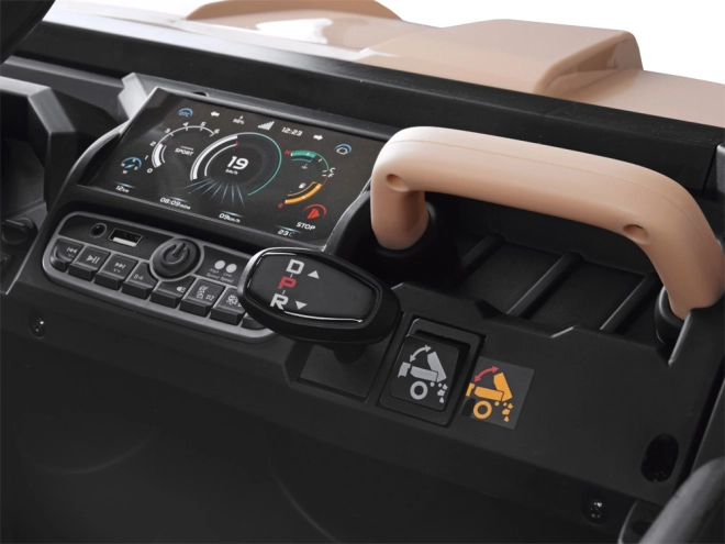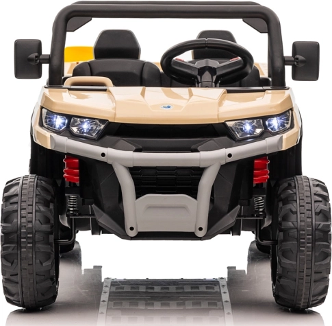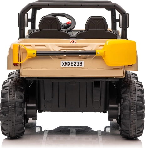 Solidny pojazd dla dzieci Farmer Truck 24V 4x6 z elektryczną wywrotną skrzynią oferuje realistyczne wrażenia z jazdy i „pracy na budowie”. Posiada 4 mocne silniki 75 W, miękkie koła EVA dla komfortu, podwójne siedzisko z ekoskóry, płynny start, przednie oświetlenie oraz rodzicielski pilot 2,4 GHz dla bezpiecznego sterowania. Idealny do przewozu zabawek czy liści dzięki elektrycznej wywrotce i dołączonej łopatce.