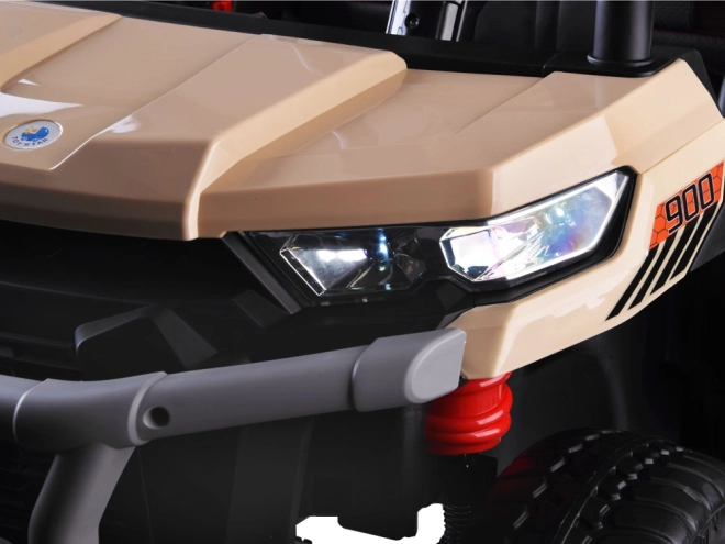 Miękkie koła EVA, amortyzacja, podwójne siedzisko z ekoskóry i 1‑punktowe pasy. Rodzic ma kontrolę dzięki pilotowi 2,4 GHz z funkcją hamulca.