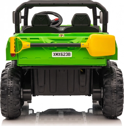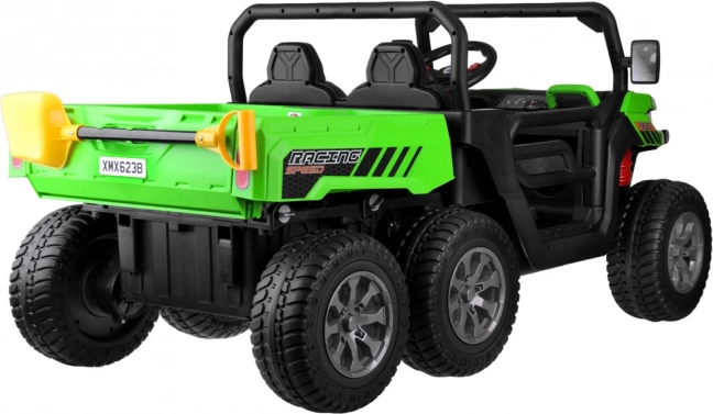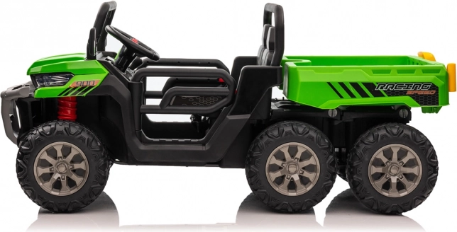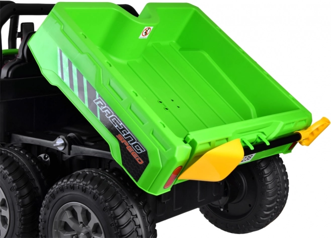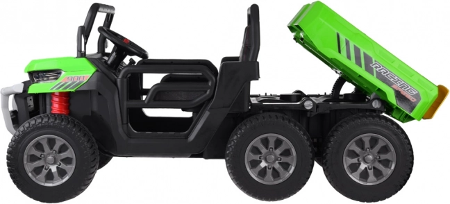 Solidny dziecięcy samochód elektryczny 24V z 6 kołami, dwumiejscowym siedzeniem z ekoskóry oraz elektrycznie sterowaną wywrotną skrzynią do świetnej zabawy na świeżym powietrzu. Oferuje 4 mocne silniki, miękkie koła EVA, łagodny start, przednie oświetlenie i rodzicowski pilot 2,4 GHz dla bezpiecznej jazdy. Idealny do przewożenia zabawek, liści czy koszyka piknikowego.