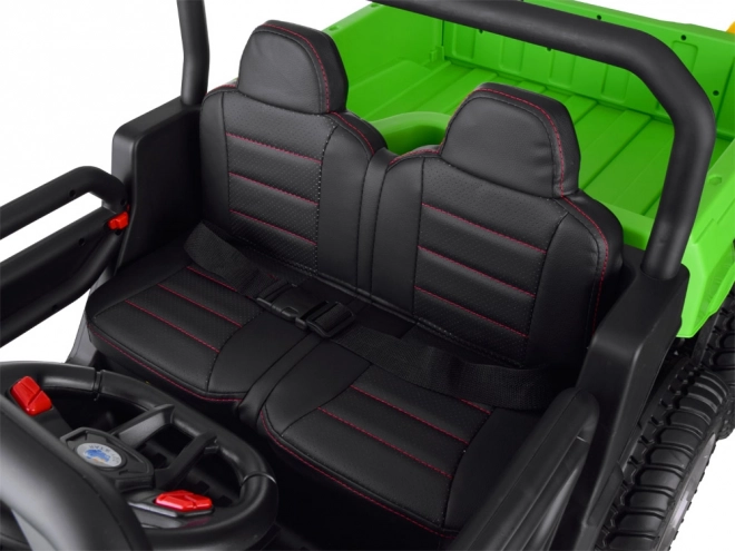 Szerokie, dwumiejscowe siedzenie z ekoskóry, pas bezpieczeństwa i otwierane drzwi z blokadą zapewniają wygodną i bezpieczną jazdę dla dwojga dzieci.