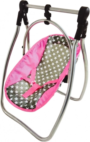 Ten praktyczny zestaw łączy dwie ulubione zabawki w jedną: w mgnieniu oka zamienisz huśtawkę w krzesełko do karmienia dzięki zdejmowanemu górnemu pałąkowi i dołączonemu stolikowi. Solidna metalowa rama, plastikowe łączniki i wysokiej jakości tekstylny pokrowiec we wzór gwiazdek zapewniają bezpieczeństwo i wygodę dla lalki.