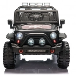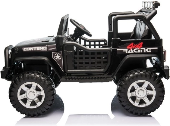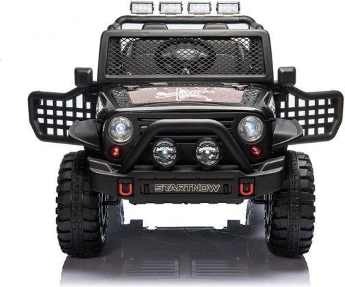 Odkryj nowoczesny dziecięcy elektryczny samochodzik z atrakcyjnym terenowym wyglądem i wyrazistymi elementami, takimi jak masywne opony, przedni zderzak ochronny i listwa świetlna. Czarna wersja prezentuje się elegancko i jednocześnie sportowo, przyciągając wzrok od pierwszego spojrzenia.