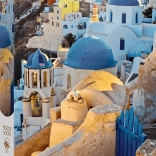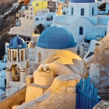 Obraz przedstawia ikoniczną architekturę Santorini z białymi budynkami i niebieskimi kopułami. Zachwycający widok na śródziemnomorskie otoczenie.