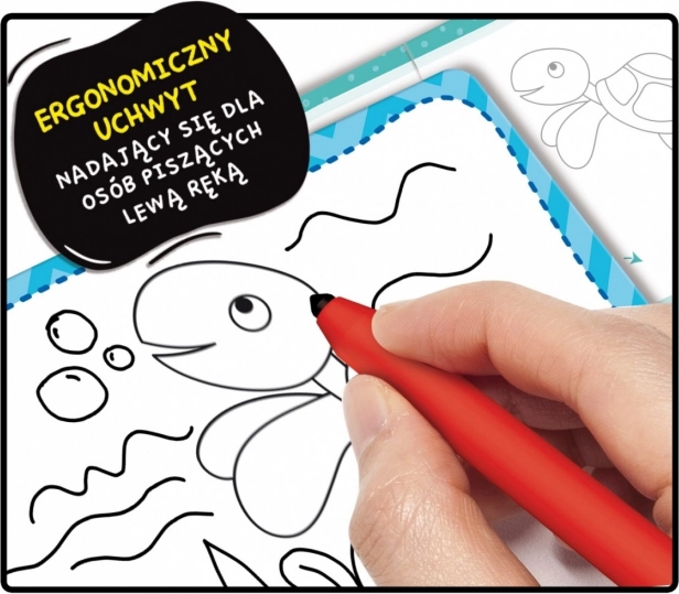 Bogaty zestaw edukacyjny do nauki rysowania. W opakowaniu znajduje się wyjątkowe ergonomiczne pióro z wypustkami na palce, odpowiednie dla dzieci i uczące prawidłowego chwytu.