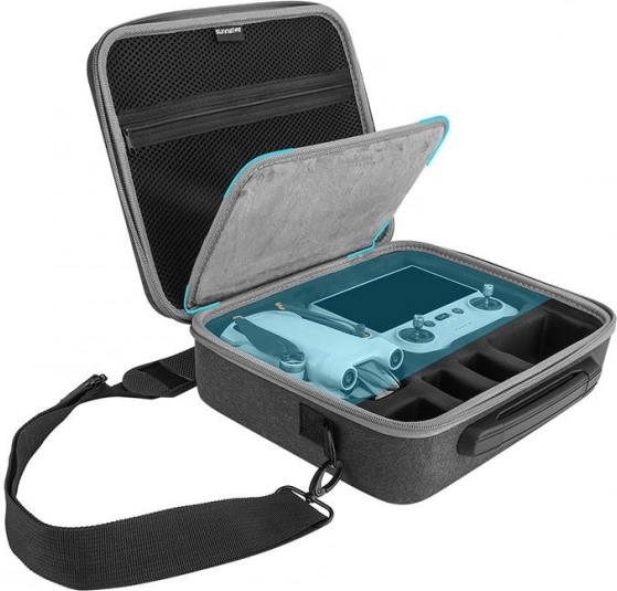 Torba zawiera oddzielne przegródki na drona, kontroler i akcesoria, zapewniając ich bezpieczne przechowywanie.