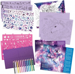 Odkryj magię twórczej zabawy z kolorowankami Nebulous Stars w fioletowej odsłonie. Ten bogato wyposażony zestaw zawiera wszystko do tworzenia magicznych rysunków fantastycznych koni – od naklejek i szablonów po plastikowe foremki i kredki. Idealny dla dzieci od 7 lat, które kochają fantazję, kolory i precyzyjne detale. Stwórz własne gwiezdne opowieści i rozwijaj małą motorykę oraz wyobraźnię dzięki 250 naklejkom, 80 szablonom i 12 kredkom w jednym opakowaniu.