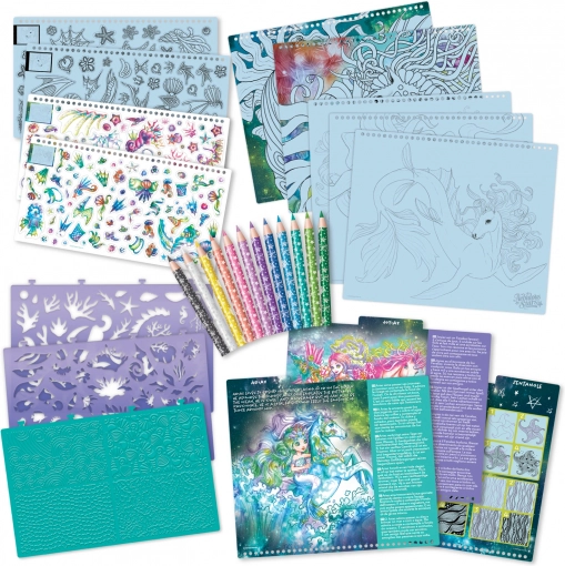 - 250 naklejek, 12 kredek, 80 szablonów, 35 arkuszy z obrazkami, 4 plastikowe foremki, instrukcje 12 technik rysunkowych