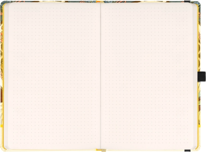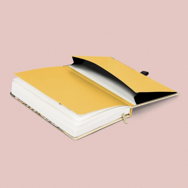 Elegancki notes z motywem dzieła Alfonse Muchy w twardej oprawie oferuje 172 kropkowane strony na żółtym papierze, elastyczne zamknięcie na gumkę, wewnętrzną kieszonkę na drobiazgi oraz uchwyt na długopis – idealny do notatek, planowania i kreatywnego szkicowania.