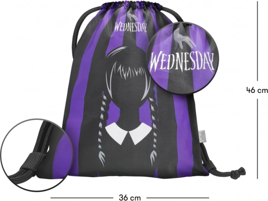 Lekki i praktyczny worek na plecy z ikonicznym motywem Wednesday świetnie uzupełni każdy casualowy strój. Dzięki wytrzymałemu, łatwemu w pielęgnacji materiałowi nadaje się do codziennego użytku – do szkoły, na salę gimnastyczną i na wycieczki.