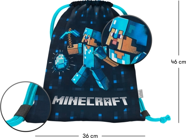 Stylowy woreczek MINECRAFT Blue Axe jest idealny do szkoły, na zajęcia dodatkowe i aktywności w czasie wolnym. Dzięki trwałemu i zmywalnemu materiałowi wytrzymuje codzienne użytkowanie i łatwo utrzymać go w czystości. Solidne sznurki ściągające pełnią jednocześnie funkcję szelek, dzięki czemu możesz wygodnie nosić woreczek na plecach.