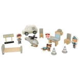 W zestawie znajduje się radiowóz, helikopter, pies, policjant i złodziej, pachołki drogowe oraz meble do szczegółowych historii.