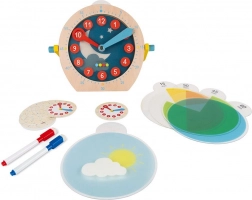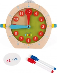 - Drewniany zegar, 14 szt. ścieralnych kart, 2 kolorowe markery