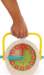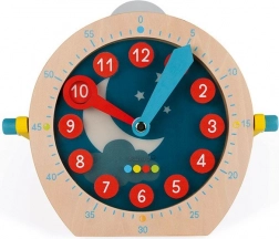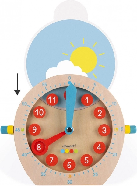 Drewniany zegar edukacyjny JANOD pomaga dzieciom szybko i z radością zrozumieć, która jest godzina. Duża tarcza z czytelnymi cyframi i kolorowymi wskazówkami prowadzi krok po kroku do zrozumienia czasu, niezależnie od tego, czy trenują pełne godziny, półgodziny czy minuty.