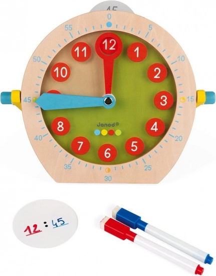 Odkryj zabawny sposób, w jaki dzieci nauczą się odczytywać czas: drewniany zegar JANOD ze ścieralnymi kartami i dwoma markerami. Dzięki wyraźnym cyfrom, płynnie regulowanym wskazówkom i praktycznym kartom do zapisu dzieci w formie zabawy ćwiczą czytanie godzin, orientację w czasie oraz motorykę małą. Zestaw zawiera łącznie 14 kart i 2 markery. Zegar edukacyjny dla dzieci od 3 lat, płynnie regulowane wskazówki, ścieralne karty do wielokrotnego użytku.