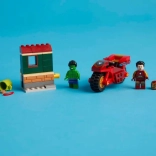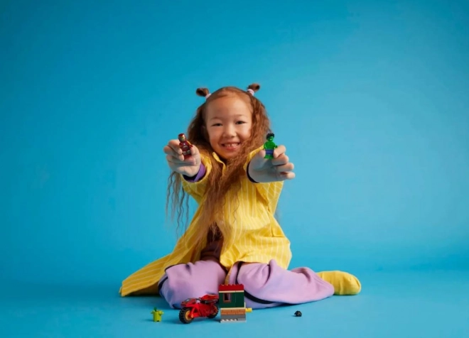 - Akcyjne dodatki: czerwony motocykl, mała konstrukcja z funkcją zawalenia i tematyczne elementy
