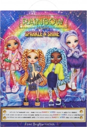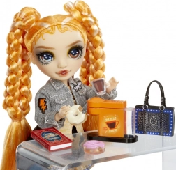 Lalka RAINBOW HIGH Sparkle & Shine Clementine oferuje wyrazisty pomarańczowy look, dżinsową kurtkę, spódnicę w kratę i platformowe buty z napisem RAINBOW. W zestawie znajduje się stojak, grzebień oraz tematyczne akcesoria inspirowane kawą, które poszerzają możliwości zabawy i opowieści.
