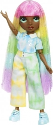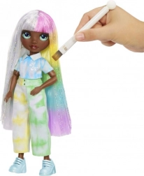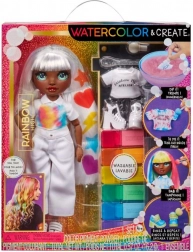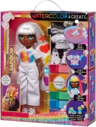 Odkryj świat kolorów z kreatywną lalką RAINBOW HIGH Watercolor & Create. Wsyp proszek do wody, zanurz włosy lub strój i przy pomocy gąbeczki twórz oryginalne wzory. Wykorzystaj gumki do tie-dye i stwórz unikalny streetwearowy look. Kolory są zmywalne, więc możesz zmieniać styl w kółko.