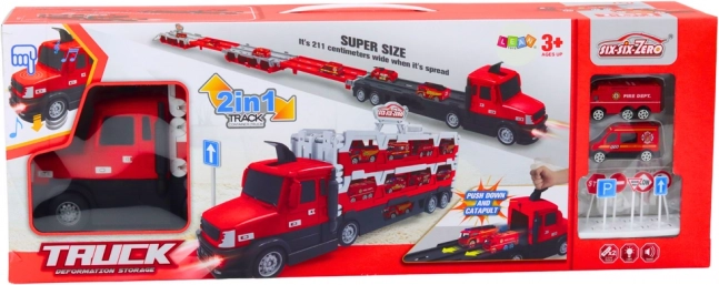 - Dziecięcy autotransporter 2w1 z rozkładanym torem wyścigowym