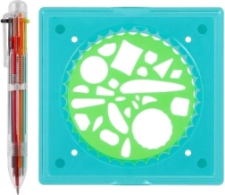 4 kółka z ponad 65 kształtami, 1 ramka z antypoślizgowym uchwytem, sześciokolorowy długopis, książka z przykładami
