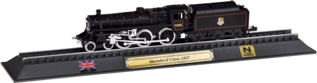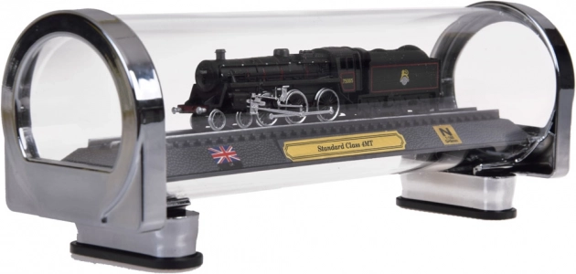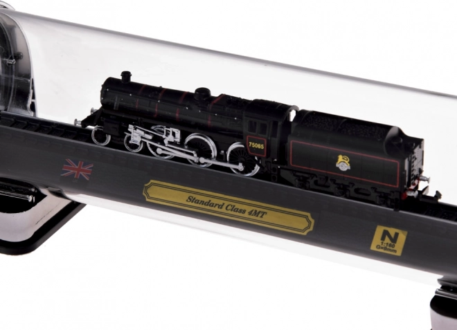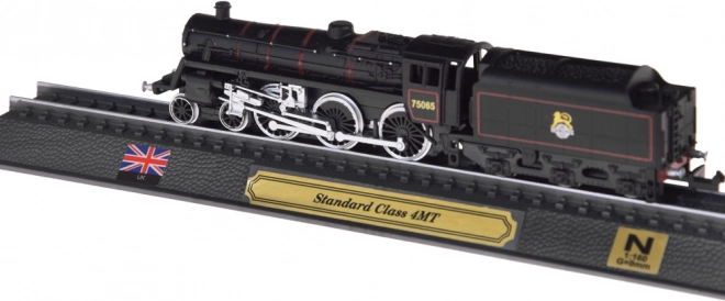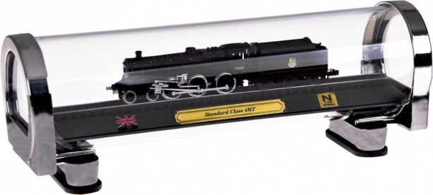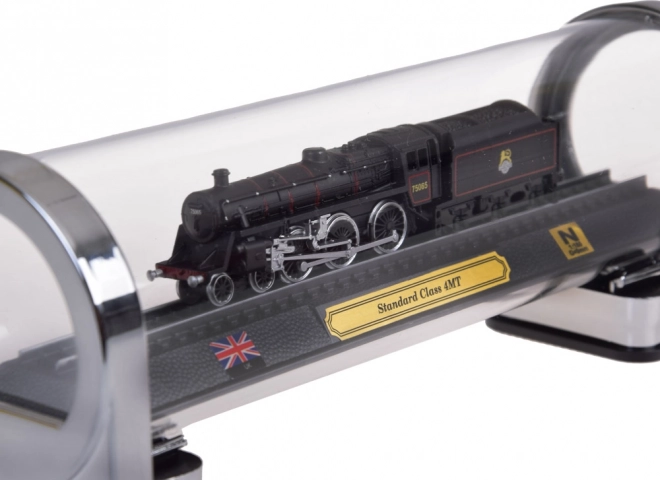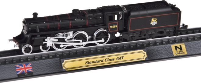 Ten detaliczny model brytyjskiej parowej lokomotywy STANDARD CLASS 4MT to idealny wybór dla miłośników kolei i stylowych dekoracji. Precyzyjne wykonanie w skali 1:160 podkreśla autentyczne detale, kontrastowe malowanie i delikatne linie kół. Model jest zamocowany na odcinku torów na eleganckiej podstawie z plakietką, brytyjską flagą i oznaczeniem skali.