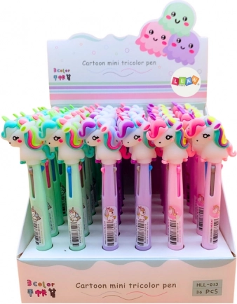 Zabawny i praktyczny wielokolorowy długopis z motywem jednorożca oferuje 3 kolory w jednym. Łatwe przełączanie jednym kliknięciem, idealny do pisania i rysowania, atrakcyjny dla dzieci od 3 lat, z certyfikatem CE. Kolor obudowy wybierany losowo. Cena za 1 sztukę.