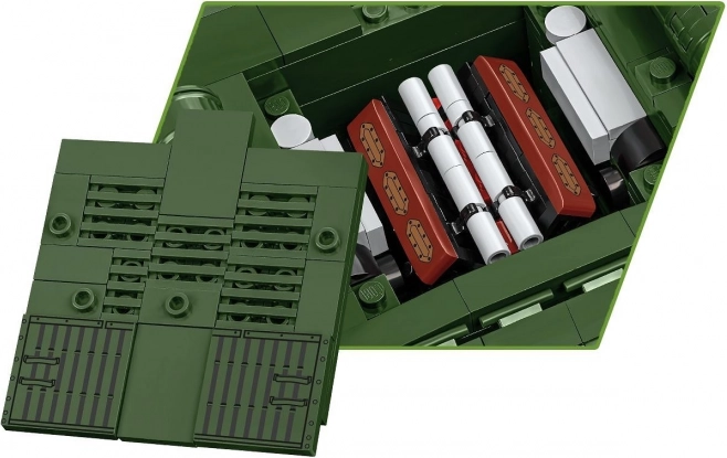 Wieża jest obrotowa, lufa podnosi się i opada, a gąsienice podczas poruszania modelu naprawdę pracują. Pod zdejmowaną wieżą znajdziesz imitację wnętrza, a pod klapą serwisową można umieścić model silnika W-11. Precyzyjne nadruki peryskopów i innych detali podkreślają autentyczność. Zestaw jest w pełni kompatybilny z innymi markami klocków.