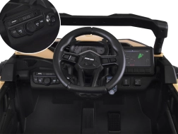 Mały kierowca doceni efekty świetlne (przednie i tylne LED), dźwięk silnika przy uruchamianiu i wbudowane melodie. Na desce rozdzielczej znajduje się panel multimedialny z USB i MP3, wskaźnik poziomu baterii, wybór szybko/wolno, jazda do przodu/tyłu, przełącznik 2x2/4x4 oraz przełącznik ręcznie/zdalnie. Rodzice mają do dyspozycji pilot 2,4 GHz z przyspieszaniem w 3 stopniach i przyciskiem bezpieczeństwa Stop.