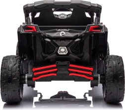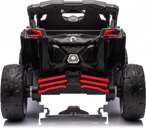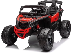 Mocne dziecięce buggy 4x4 o mocy 800 W oferuje płynny start, cztery silniki 24 V/200 W, akumulator 24 V 5 Ah oraz pilot 2,4 GHz dla rodziców. Komfort zapewniają siedzenie z eko skóry, pięciopunktowe pasy, miękkie koła EVA i amortyzacja z przodu i z tyłu. Dla zabawy przygotowano światła LED, dźwięki silnika i muzykę z panelu z USB/MP3.