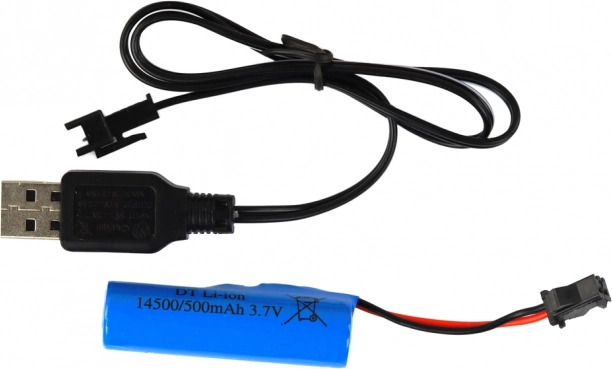 W zestawie akumulator Li-ion 3,7 V 500 mAh oraz ładowarka USB. Ładowanie do 2 godzin, czas jazdy do 30 minut na jednym ładowaniu.