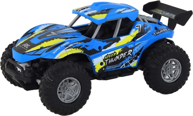 To nie tylko dziecięcy samochód terenowy, stworzony do zabawy w ogrodzie i w domu. Duże, głęboko żłobione koła zapewniają świetną przyczepność, a napęd na tył daje modelowi dynamikę i żwawe starty. Sportowy niebieski design z wyrazistą grafiką przyciąga wzrok od pierwszego spojrzenia.