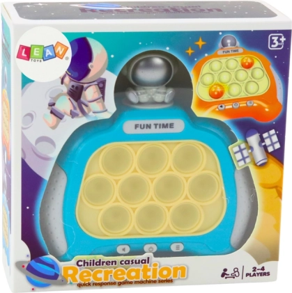 Interaktywna gra Pop It z kosmonautą: światła, dźwięki, trening refleksu i koordynacji. Kompaktowe wymiary, od 3 lat, zasilanie 3× AAA, certyfikacja CE, EN71.