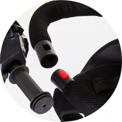 Bezpieczeństwo zapewniają pięciopunktowe pasy z miękkimi nakładkami na ramiona, pałąk ochronny, osłona przedniego koła przeciw wciągnięciu stóp oraz hamulce nożne na tylnych kołach. Praktyczne wyposażenie obejmuje przedni i tylny kosz, torbę na akcesoria na drążku prowadzącym oraz kierownicę z muzyką i światłem (2× AA, 1,5 V).