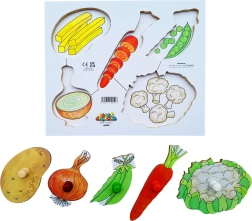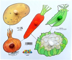 To drewniane puzzle zostało zaprojektowane w taki sposób, aby dzieci mogły zapoznać się z warzywami nie tylko w całości, ale i po pokrojeniu. Dzieci za pomocą kołeczków łatwo chwycą poszczególne elementy i nauczą się przyporządkowywać właściwe warzywa do ich pokrojonych wersji. Cechy produktu: