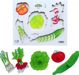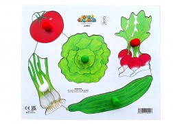 Te drewniane puzzle dają dzieciom możliwość nauki rozpoznawania różnych rodzajów warzyw. Kołeczki na układankach umożliwiają łatwy uchwyt i manipulację.