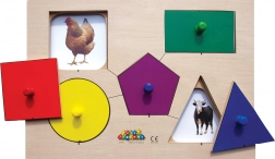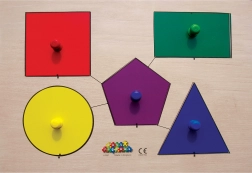 Dzieci nauczą się rozpoznawać różne kształty i kolory dzięki pięciu kolorowym kształtom i ich precyzyjnym otworom w desce.
