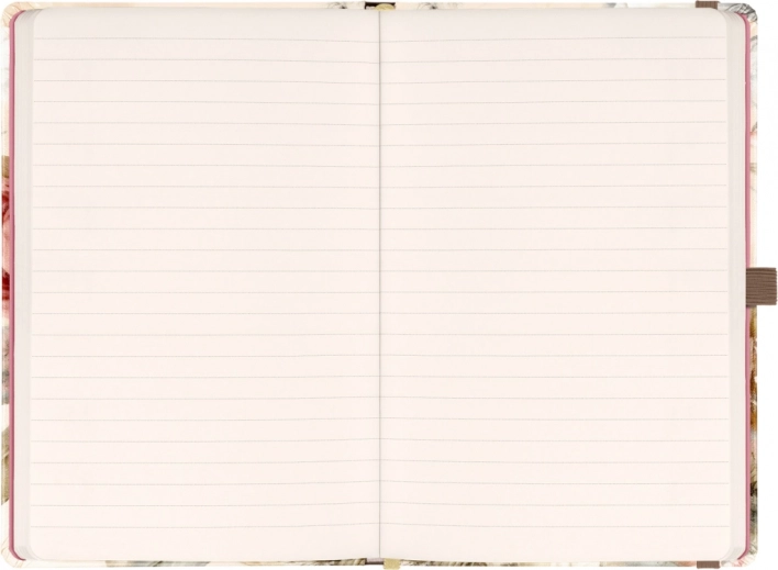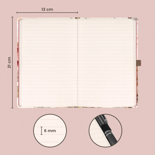 Elegancki notes NOTIQUE z motywem pudrowych kwiatów w praktycznym formacie 13 × 21 cm oferuje 172 strony w kropki na żółtym papierze, twardą oprawę, zapięcie na gumkę, uchwyt na długopis oraz wewnętrzną kieszeń – idealny do prowadzenia dziennika, notatek i planowania.