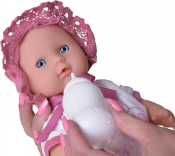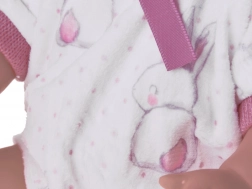 Lalka ma urocze niebieskie oczy, różową czapeczkę, biało‑różowe ubranko z motywem króliczka oraz różowe buciki/skarpety. Ręce i nogi są ruchome, korpus wykonano z wytrzymałego plastiku o przyjemnej w dotyku powierzchni, co zapewnia łatwe czyszczenie i długą trwałość.