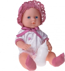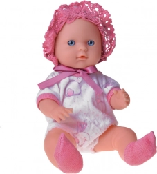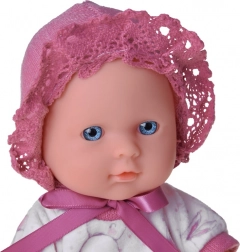 Niebieskie oczy, różowa czapeczka i biało‑różowe ubranko z króliczkiem. Ruchome kończyny i trwałe materiały zapewniają długą zabawę.