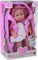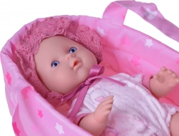 Urocze niemowlę w tekstylnym nosidełku do realistycznej zabawy w rodziców. Lalka po napojeniu z butelki pije i siusia, ma niebieskie oczy, miękkie ubranko z motywem króliczka, a w zestawie znajduje się także praktyczna przenośna torba/nosidełko ze stylowym wzorem gwiazdek. Idealna do rozwijania wyobraźni i umiejętności opiekuńczych dzieci.