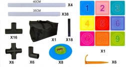 - Tarcza z polami, 8 dysków, torba, rurki 40 cm × 4, rurki 35 cm × 38, złączki × 28, rzepy × 18, plastikowe kołki × 6