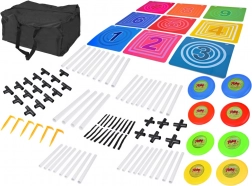 Zestaw szybko się składa i rozkłada, wszystkie elementy mieszczą się w wytrzymałej torbie. Dzięki plastikowym kołkom tarczę można przymocować na zewnątrz do podłoża, co czyni ją świetną na ogród, plac zabaw i do sali gimnastycznej. Kolorowe dyski są lekkie i bezpieczne dla dzieci.