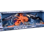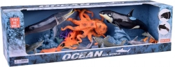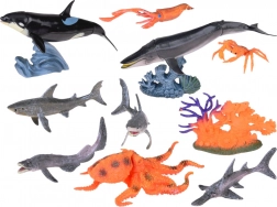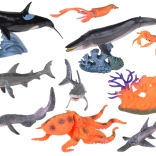Zestaw zawiera różne rodzaje stworzeń morskich, w tym wieloryba, ośmiornicę, orkę, rekina i inne.