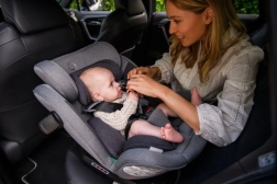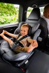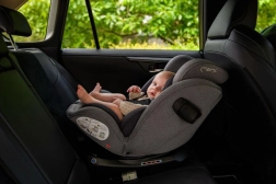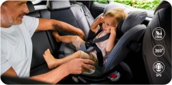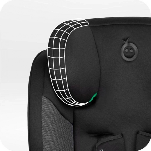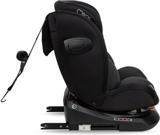 MoMi EMI oferuje obrót 360°, co umożliwia łatwe ustawienie przeciwko lub z kierunkiem jazdy. Obejmuje boczne wzmocnienia SIPS, 11 pozycji zagłówka i 6 poziomów nachylenia dla maksymalnego komfortu i bezpieczeństwa. Dodatkową pewność zapewniają systemy mocowania TOP TETHER.