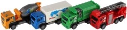 Wybierz spośród czterech typów ciężarówek, w tym betoniarki, śmieciarki, wozu strażackiego i pojazdu transportowego.