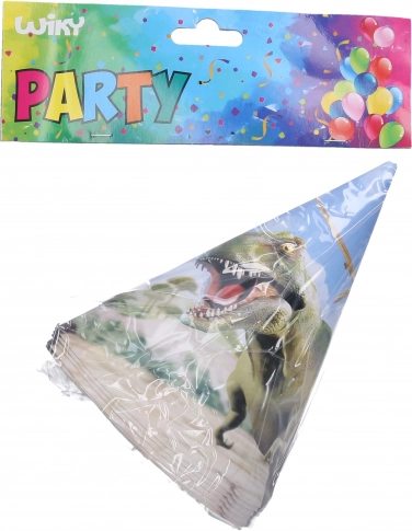 Rozwesel dziecięce przyjęcie stylowymi czapeczkami imprezowymi z motywem DINO. Praktyczny zestaw 6 sztuk o wysokości 15 cm świetnie sprawdzi się na urodzinach, przyjęciach tematycznych i szkolnych wydarzeniach.