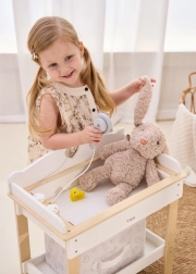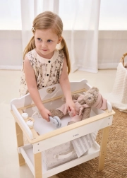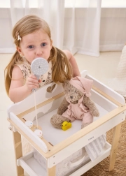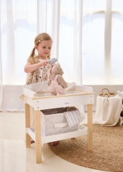 Wytrzymała drewniana konstrukcja zapewnia bezpieczną i stabilną zabawę. Minimalistyczne naturalne i białe odcienie łatwo wkomponują się w nowoczesne wnętrza. Zestaw idealny do zabawy w odgrywanie ról, wspiera małą motorykę, empatię i odpowiedzialność podczas opieki nad lalkami o wysokości do 43 cm.