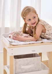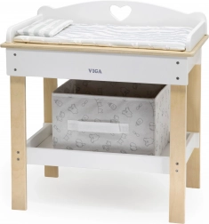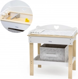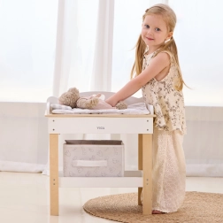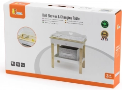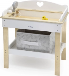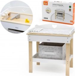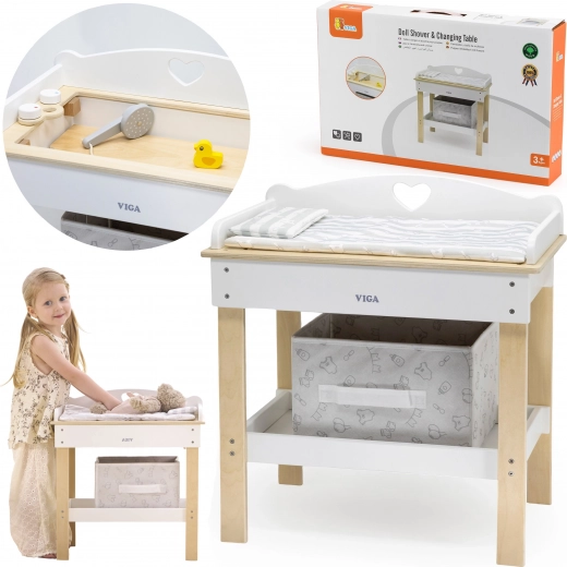 Ten multifunkcyjny zestaw marki VIGA pozwala dzieciom realistycznie bawić się w opiekę nad niemowlęciem. Górny blat pełni rolę wygodnego przewijaka; po jego zdjęciu powstaje wanienka z prysznicem do wodnych rytuałów dla lalek. Dolna półka z tekstylnym koszem utrzyma wszystkie akcesoria pod ręką i w ładzie.